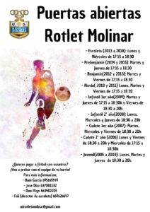 27 agosto 2021 | Por lorenzo | Categoria: Fútbol, Fútbol BaseEl Rotlet Molinar comenzará esta semana las pruebas de captación de futuros jugadores. Desde este lunes estarán abiertas para recibir a todos los niños/as que deseen formar parte de nuestro club.