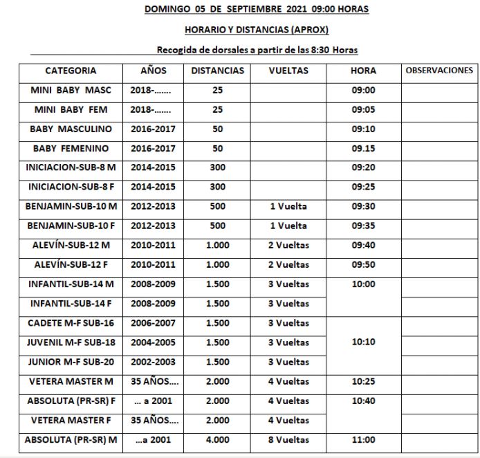 Todas las carreras igual masc y fem excepto la absoluta fem que serán 2.000 metros.