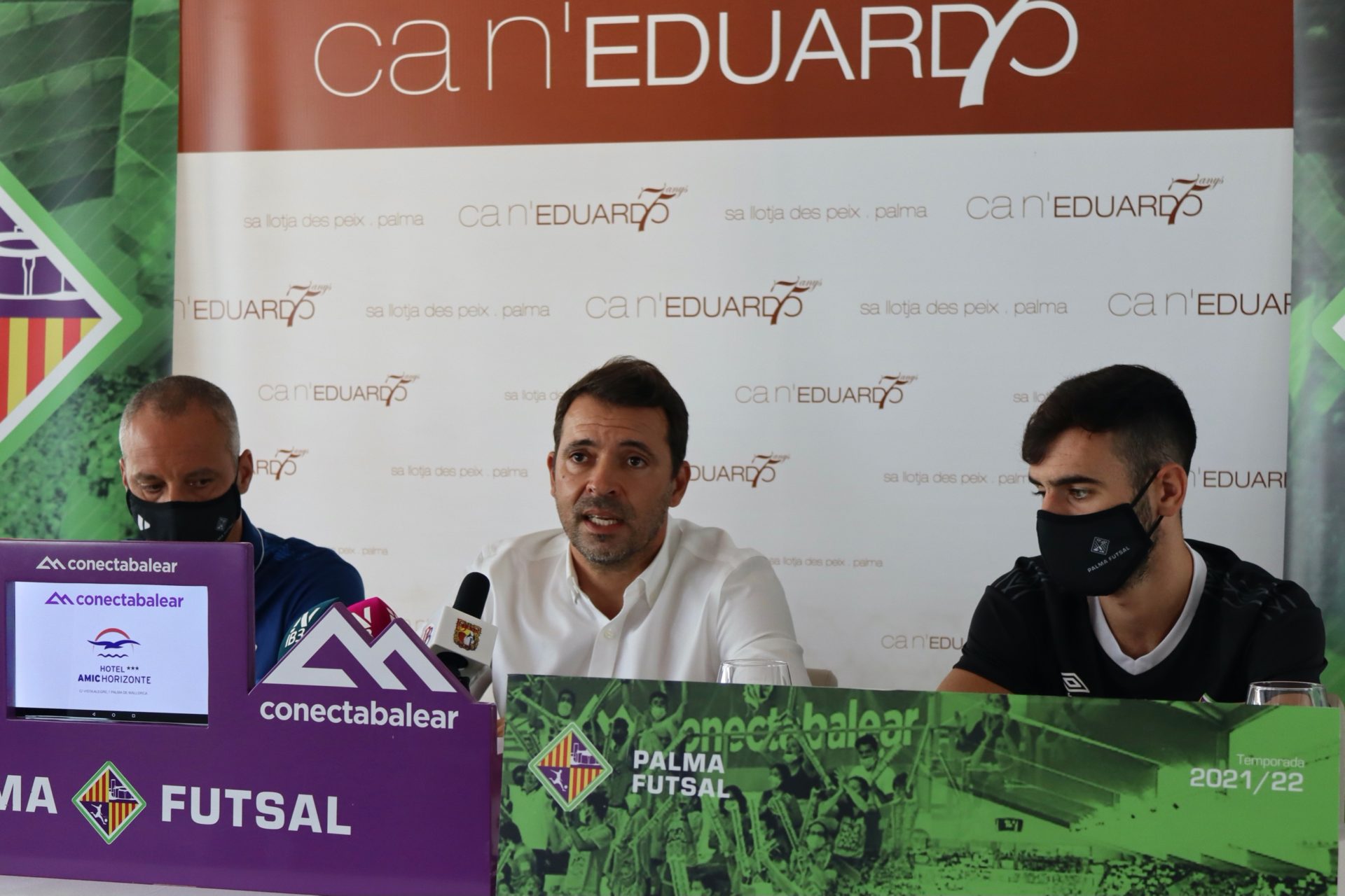 Emoción a flor de piel en la rueda de prensa de presentación de la campaña de abonados 2.021/22 del Palma Futsal que se ha realizado en el Restaurante Ca´n Eduardo de Palma. José Tirado, Vadillo, Barrón y Eloy Rojas han comparecido ante los medios de comunicación y han transmitido la emotividad y el sentimiento de la campaña de socios de esta temporada.