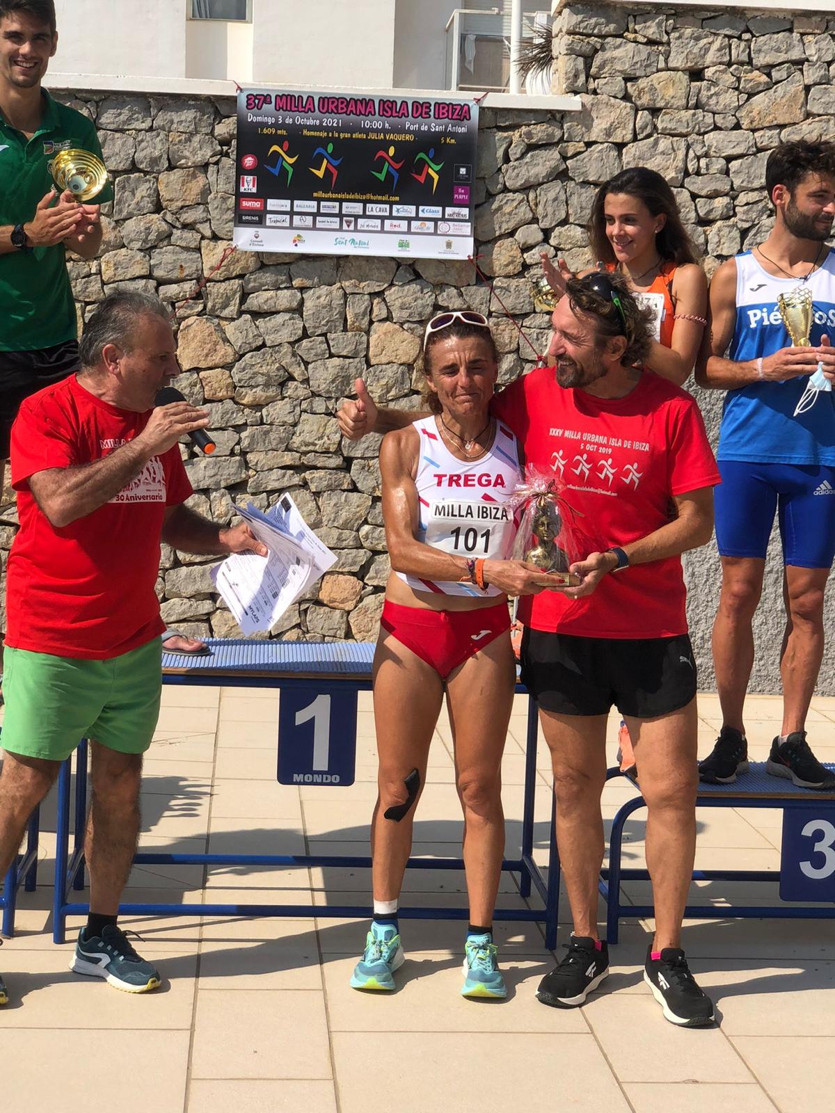 Sin duda, la autentica protagonista de esta edición de la Milla de Ibiza, fue Julia Vaquero, la exatleta que ahora se ha vuelto a poner las zapatillas y la verdad es que después de 20 años esta perfectamente integrada, ahora ya en la categorÃa Master. Primero porque en la Milla de Elite Femenina a punto estuvo de subirse al pódium, siendo finalmente 4ª, pero es que además gano la carrera femenina de los 5K y ya por ultimo en el homenaje que la organización de la Milla y varios amigos, reconocieron  a una grande del atletismo español. Alla en la segunda parte de los 90, en donde obtuvo varios tÃtulos nacionales en Cross y en 5.000, fue pódium en Campeonatos Europeos y se planto dando guerra en las Olimpiadas de Atlanta en los 10.000 m que quedo 9ª. Pero el mayor éxito lo consiguió en una carrera que llevo a cabo en 1996 en Oslo, en donde establecio una gran marca en 5.000 m 14:44:95 marca que a dia de hoy y 25 años después, ninguna atleta española ha logrado arrebatarle. Esto sin olvidarnos de dos Sub Campeonatos Europa de Cross (94 y 96), un 3º en un Europeo de Cross por equipos 1997 y un 4º en un Mundial de Cross en el 1997. Durante entrega de premios, su entrenador Franc Beneyto y un amigo que fÃsicamente no estaba presente, pero si lo estuvo de corazón, Alex Calabuig le entregaron una bonita figura de la Diosa Tanit.Â