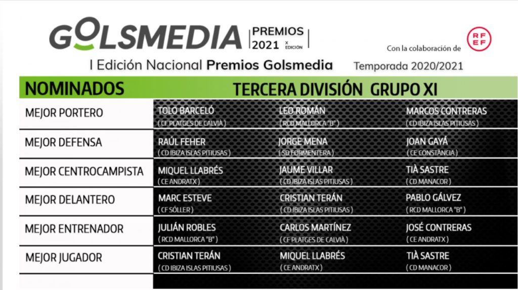 Tras los votos de los técnicos de cada grupo, los lectores y la prensa, los Premios Golsmedia 2020/2021 en Tercera División, nomenclatura que este año ha pasado a denominartse Tercera RFEF, destacarán las actuaciones individuales en las siguientes categorÃas: mejor portero, mejor defensa, mejor centrocampista, mejor delantero, mejor jugador y mejor entrenador.