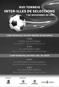 26 octubre 2021 | Por lorenzo | Categoria: FFIB, Fútbol, Horarios y resultadosVuelve el Torneo Interilles de selecciones de Malllorrca , Ibiza y Formentera en categoria FUTBOL-8 ALEVIN (Femenino) y en Masculino Alevin, Infantil y Cadete