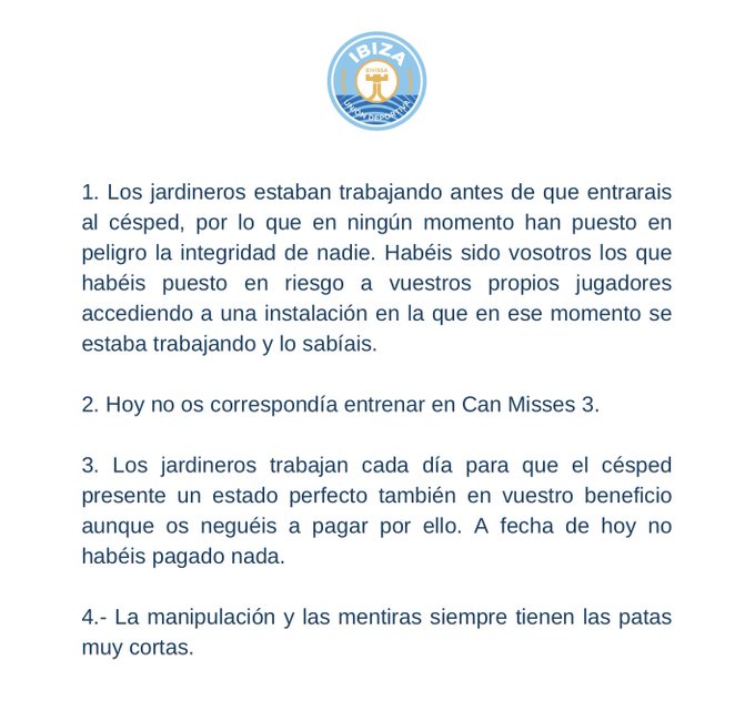 El CD Ibiza se ha presentado a entrenar en Can Misses 3 y la UD Ibiza, que no quería permitir la sesión, ha encendido los aspersores y ha dado órdenes para que los cortacésped entraran al campo mientras jugaban los rojillos. Se vivió así un episodio esperpéntico en la instalación, acrecentado cuando Ángel Nadal, vicepresidente de la ‘Udé’, se encaró con algunos jugadores como Gianluca Simeone al no querer abandonar el campo. Seis agentes de la Policía Nacional se personaron en Can Misses 3. Ordenaron la retirada de las máquinas cortacésped y que dejaran a los de Raúl Garrido entrenar.
