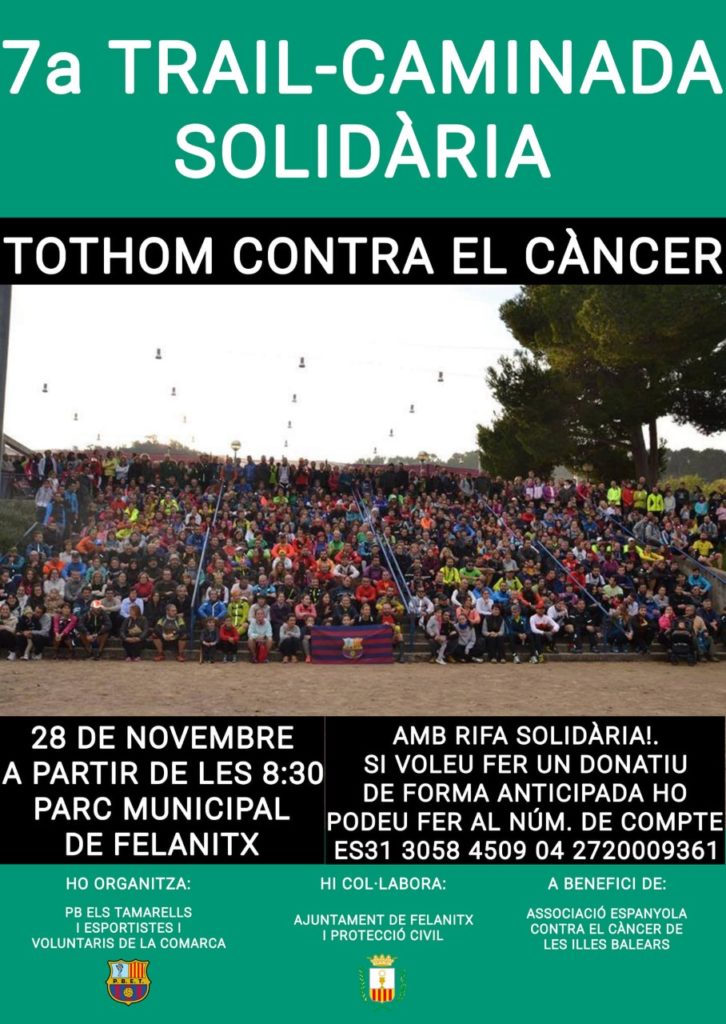 A les 9h.50’ després dels parlaments de les autoritats i representants de l’Associació Espanyola Contra el Cà ncer a Balears, es farà la gran fotografÃa de grup, i a les 10h sortirà la Trail, seran 18 kms no competitius per muntanya i a ritmes controlats per corredors de l’organització, mentre la caminada són 10 kms i sortirà dos minuts després.