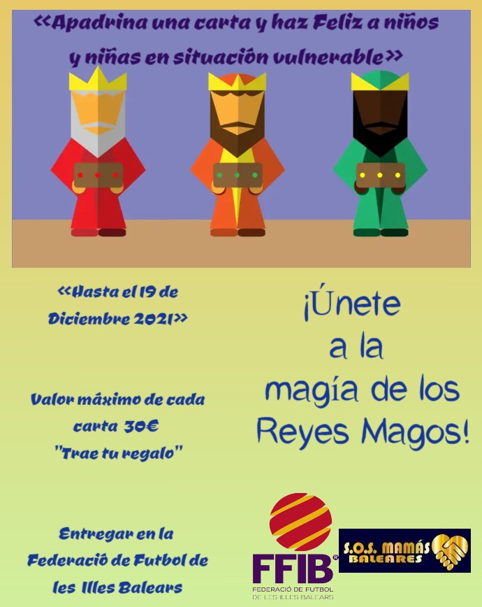 7 diciembre 2021 | Por lorenzo | Categoria: FFIB, FútbolCada vez quedan menos dÃas para la Navidad y todos los niños y niñas esperan con ilusión, tanto a Papá Noel, como a los Reyes Magos. La FFIB os anima a participar en la campaña preciosa destinada a SOS Mamás, mediante la cual, podéis ‘amadrinar’ una carta con el fin de hacer llegar regalos a todos los nenes de la Asocación que ayuda a mujeres madres en riesgo de vulnerabilidad social.