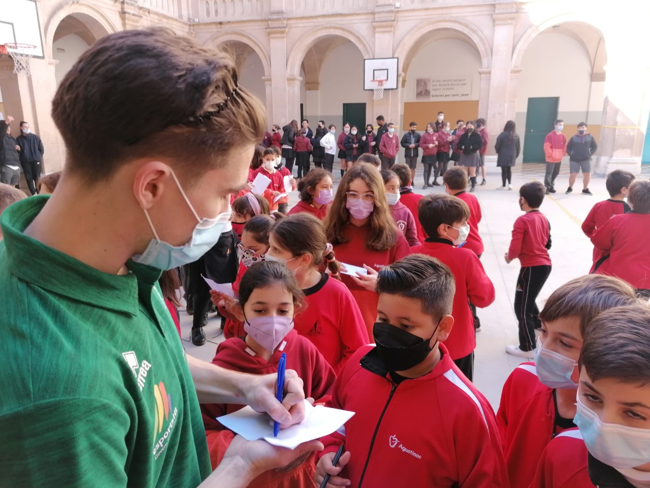 18 febrero 2022 | Por lorenzo | Categoria: PolideportivoMientras la plantilla cuenta las horas para que llegue el partido ante el Leyma Coruña, hoy una representación de los jugadores del Palmer Alma Mediterránea Palma se ha desplazado hasta el Colegio San Agustín para llevar a cabo una visita englobada dentro del programa Jugam Amb l´Elit del Departamento de Deportes del Consell de Mallorca. Pol Figueras, capitán del equipo, Wesley Van Beck, Amadi Ikpeze y Elijah Brown han acudido al centro educativo palmesano, parte muy especial de la historia del CB Imprenta Bahía San Agustín para compartir una mañana con los alumnos más pequeños del colegio palmesano.