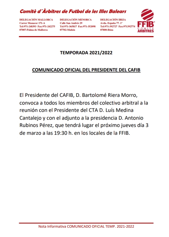 El Presidende del CAFIBÂ hace llegar el siguiente comunicado a todos los colegiados de Mallorca