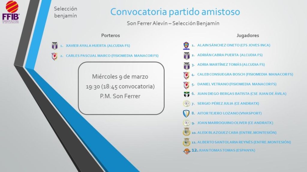 13 marzo 2022 | Por lorenzo | Categoria: Fútbol, Fútbol SalaEsta semana hubo convocatoria de la selección benjamín masculina de fútbol sala contra el Son Ferrer Alevín. La lista de convocados estuvo compuesta por: