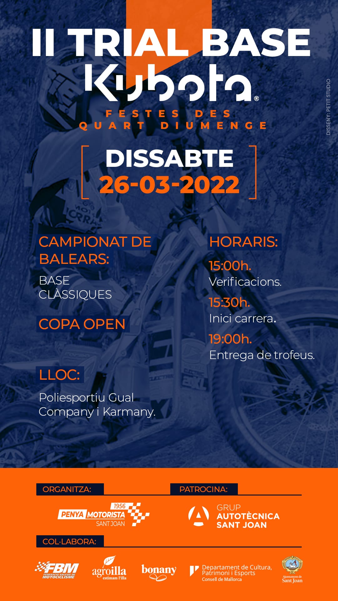 Horario: La carrera tendrá lugar a partir de las 15:30 horas en el Polideportivo Gual Company i Karmany en la localidad de Sant Joan, las verificaciones serán a las 15:00 horas en el mismo circuito.