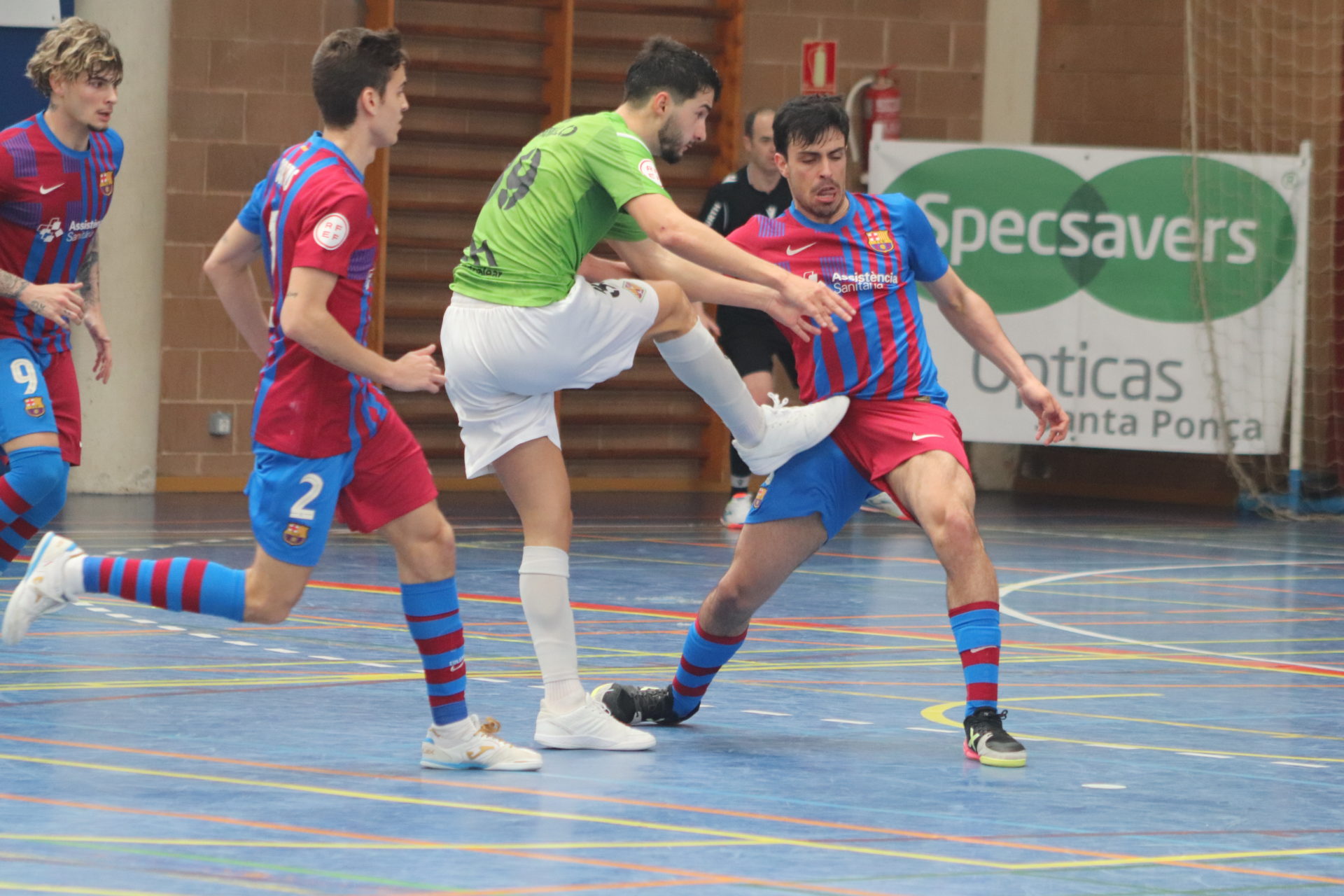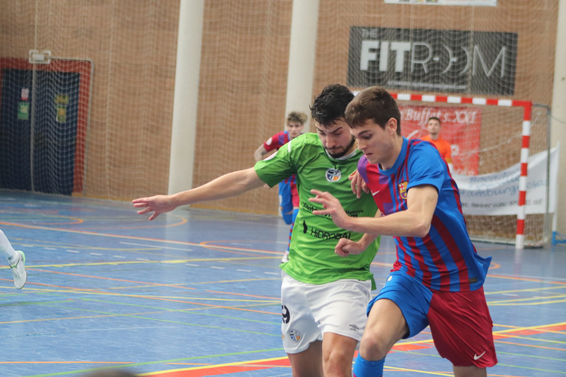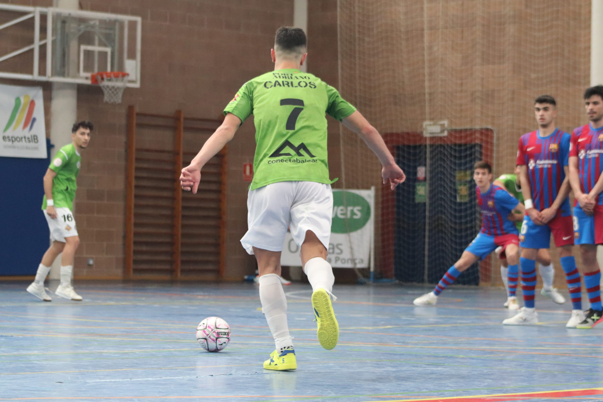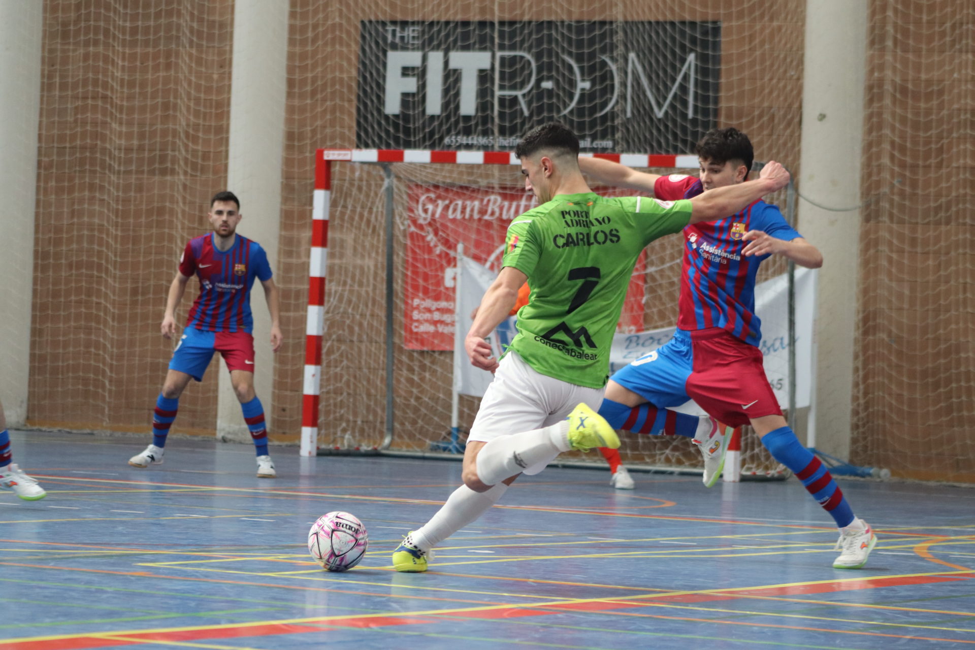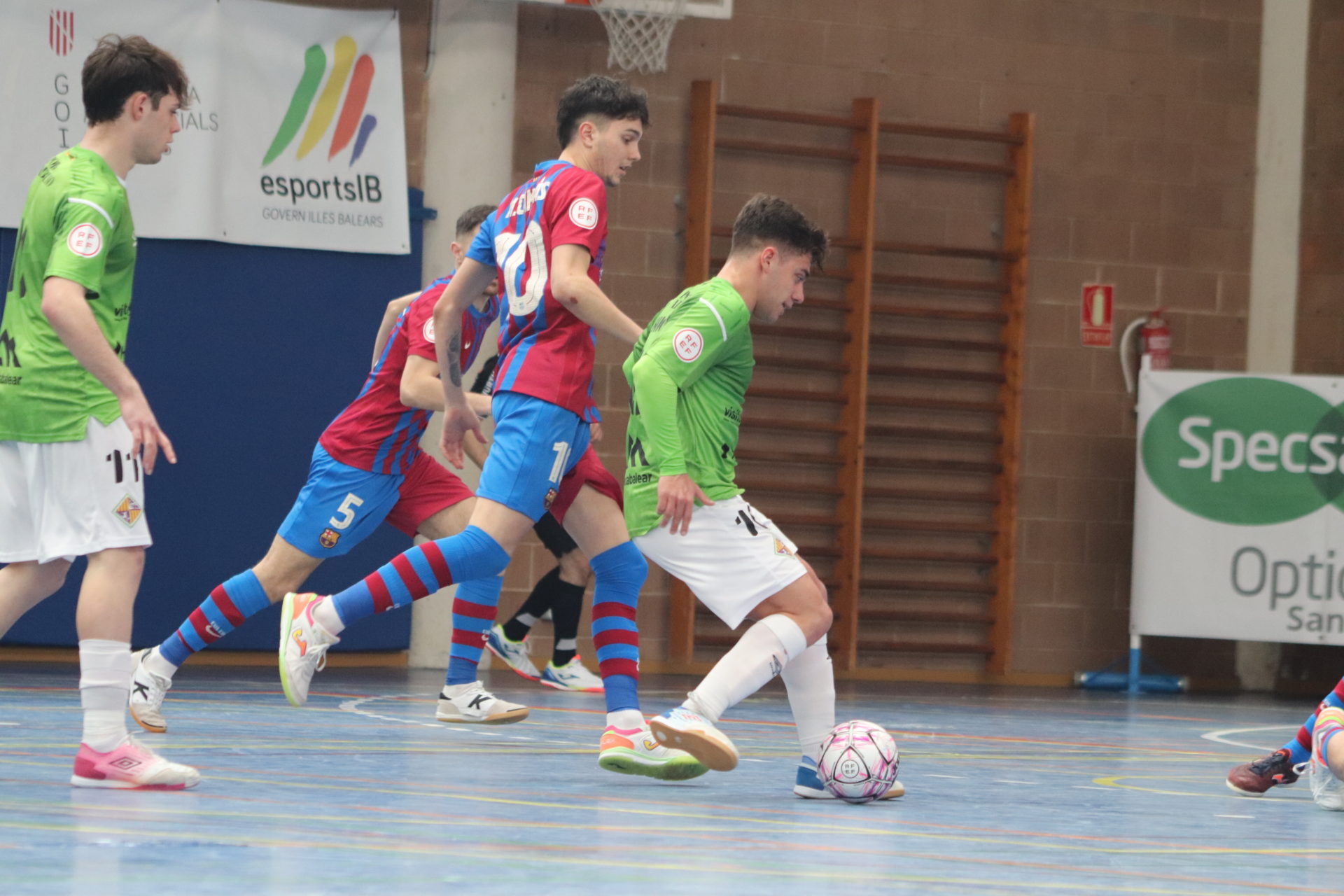El conjunto catalán se adelantó en el minuto cinco y dominó la mayor parte de la primera parte, y supo rehacerse del empate de los locales. En el minuto 16 de partido, un contragolpe del filial del Palma Futsal, culminado por Carlos, igualó el partido, aunque dos minutos después, el Barça volvió a anotar, y encima por partida doble. Mario y Rubén dejaron el marcador en 1-3 hasta el descanso.