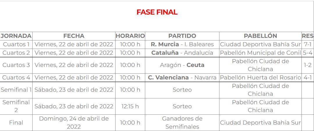 | 1 | Martes, 19 de abril de 2022 | 18:45 h | Aragón – Navarra | Pabellón Municipal de Conil | 2-3 |