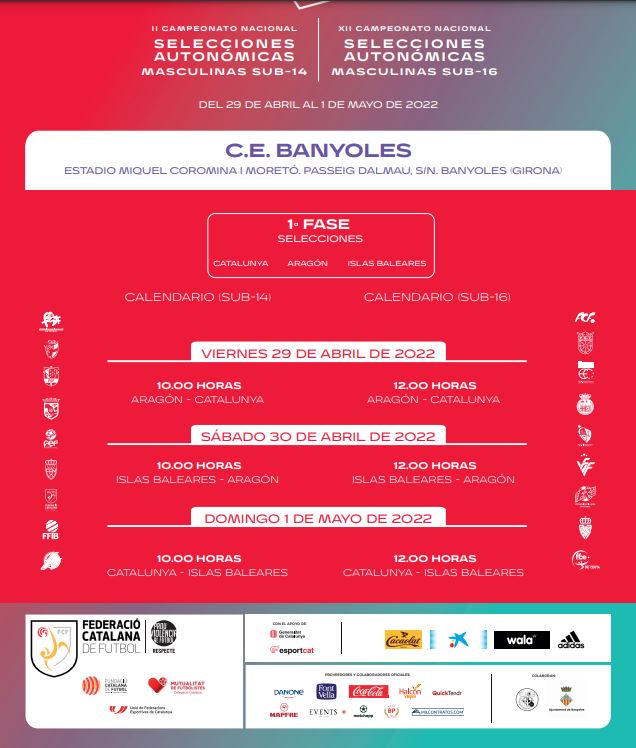 L’FCF TV oferirà en directe tots els partits de les Seleccions Catalanes masculines a la primera fase del Campionat d’Espanya, que es disputarà a l’Estadi Miquel Coromina i Moretó de Banyoles del 29 d’abril a l’1 de maig. Els combinats sub 14 i sub 16 masculins s’enfrontaran a l’Aragó i les Illes Balears.