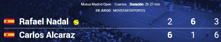 Rafa Nadal-Carlos Alcaraz (2-6 , 6-1, 3-6 ) El Murciano estara en Semifinales ante Nova Djokovic
