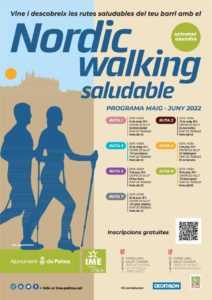 Palma, 12 de maig de 2022. L’Institut Municipal de l’Esport (IME) posa en marxa una nova edició del programa Nordic Walking Saludable, unes jornades d’iniciació a la marxa nòrdica, aptes per a tots els grups de població, que compten amb la col·laboració de la Direcció General de Salut Pública i Participació de la Conselleria de Salut i Consum i la Gerència d’Atenció Primària de Mallorca.