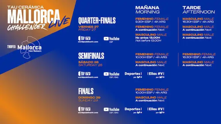 La emisión comenzará el viernes 27 con 3 partidos de cuartos femeninos desde las 9:30 h y continuará con 3 partidos de cuartos masculinos a partir de las 16:30 h. Todos ellos se retransmitirán en castellano por el canal de Youtube de World Padel Tour y por al OTT worldpadeltourtv.com