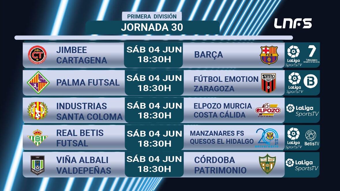- JORNADA 30: JIMBEE CARTAGENA – BARÇA, sábado 04/06/2022 a las 18:30 horas LaLigaSportsTVPlus/La7.