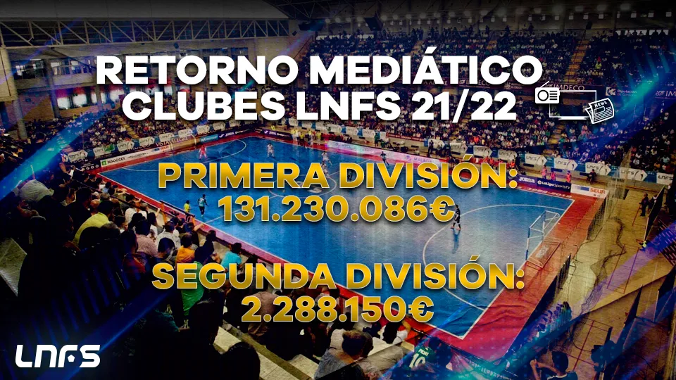 La LNFS mantiene en su estrategia de marketing y comunicación su apuesta por dar valor a los clubes y sus patrocinadores, potenciando la rentabilidad de su inversión gracias a la difusión que la Asociación realiza durante la temporada dando cobertura diaria a la competición, que se ve reflejada en televisión, radio, prensa escrita y a través de las redes sociales. Con estos datos, la consultora Kantar Media ha remitido a la LNFS, y ésta a sus clubes, los informes auditados correspondientes a la temporada 2021/2022, en los que ha registrado un retorno mediático en televisión y prensa por un valor 131.230.086€ para Primera División y de 2.288.150€ para Segunda División.