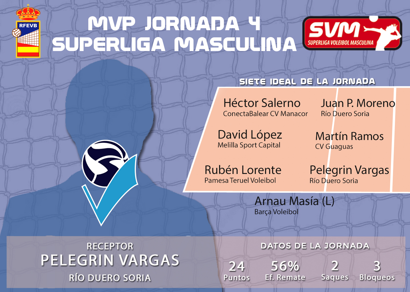 25 octubre 2022 | Por lorenzo | Categoria: PolideportivoEl receptor de RÃo Duero Soria, Pelegrin Vargas, es elegido MVP de la cuarta jornada de la Superliga Masculina al liderar, junto a su compañero Juan Pablo Moreno, también en el siete ideal del fin de semana, el triunfo del conjunto soriano en su visita a Léleman Conqueridor Valencia. invicto hasta entonces. Los 24 puntos del puertorriqueño con un 56% de eficacia, 2 saques directos y 3 bloqueos, permitieron al conjunto de Alberto Toribio asaltar el Municipal de Benicalap. La representación soriana en el septeto ideal de la cuarta jornada se completa con la presencia del opuesto Juan Pablo Moreno, destacando por sus nueve saques directos en el choque ante el conjunto valenciano.Â