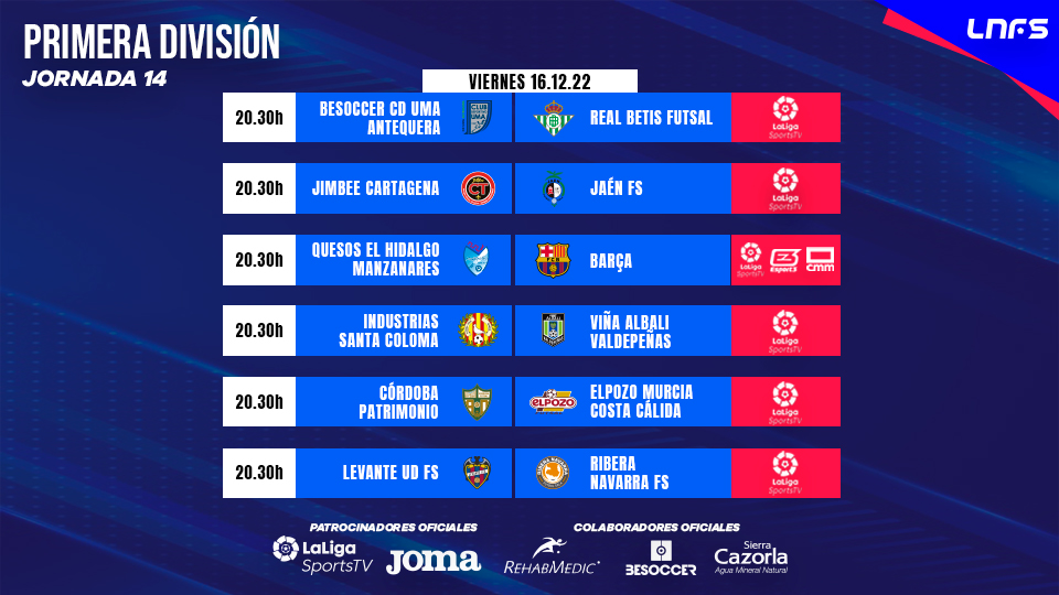 El choque entre Quesos El Hidalgo Manzanares y Barça será el último televisado de la unificada Jornada 14. El duelo entre castellano-manchegos y catalanes podrá seguirse en directo por LaLigaSportsTV, CMM TV y Esport3. Los locales llegan al partido sumidos en una mala racha de resultados al encadenar tres derrotas de manera consecutiva pese a las buenas sensaciones dejadas en esos encuentros. Por su parte, el equipo de Jesús Velasco llega tras una contundente victoria por 8-1 frente a un rival directo como es Jimbee Cartagena. El equipo culé buscará sumar tres puntos que les conviertan en campeones de invierno y cerrar la primera vuelta de la mejor manera posible.