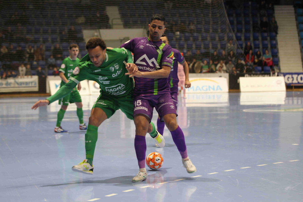 El Mallorca Palma Futsal comenzó el partido de la mejor manera posible. Ya en la primera aproximación, Eloy Rojas aprovechó un descuido rival para colocar el balón en la misma escuadra con un potente disparo. Durante los minutos siguientes, el conjunto de Vadillo acaparó la posesión del esférico, aunque el buen hacer defensivo del Osasuna impidió que los visitantes llegaran con claridad al área contraria. El Palma continuó insistiendo y fue encerrando a los locales en su propia área. Eloy Rojas fue uno de los más activos en ataque, cada vez que tuvo ocasión lo intentó, mientras que los del Xota se limitaron a contragolpear. Los mallorquines atacaron constantemente, pero los locales también generaron algunas acciones con peligro, pero Luan Muller, siempre atento, desbarató cualquier intento de los navarros. La más clara fue para Dani Zurdo, que tras un contragolpe se encontró con el portero brasileño del Palma que frustró su ataque. Por su parte, el Mallorca Palma Futsal siguió en la misma tónica hasta el descanso. Tayebi pudo aumentar la ventaja visitante en varias ocasiones. En la primera, el iraní recibió el balón en el área, pero Oihan Sánchez desvió el balón a córner con una mano. En la siguiente acción, Tayebi volvió a la carga y a la media vuelta puso a prueba al portero navarro otra vez. En los últimos minutos Rivillos también pudo marcar el segundo gol balear, el de Torrejón golpeó en la madera con un potente zurdazo. A pesar de la insistencia mallorquina, la primera parte del encuentro en Pamplona terminó con el solitario tanto de Eloy en el marcador. Aunque la última ocasión fue para Martil que también dio en el palo de la portería de Luan Muller, aunque su tiro fue muy forzado, ya que estaba demasiado escorado.
