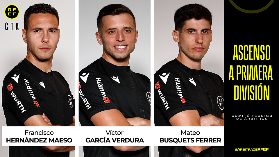 Además, hasta cinco árbitros ascienden desde Primera Federación a Segunda División: Germán Cid Camacho, Miguel González Díaz, Salvador Lax Franco, Manuel Jesús Orellana Cid y Miguel Sesma Espinosa.