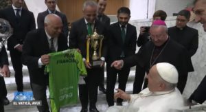 7 febrero 2024 | Por lorenzo | Categoria: Fútbol, Fútbol SalaLa expedición estaba liderada por Tomeu Quetglas, Antonio Vadillo y Carlos Barrón. José Tirado no pudo viajar a causa de una indisposición. El club ha obsequiado al Sumo PontÃfice con una camiseta y una bufanda.