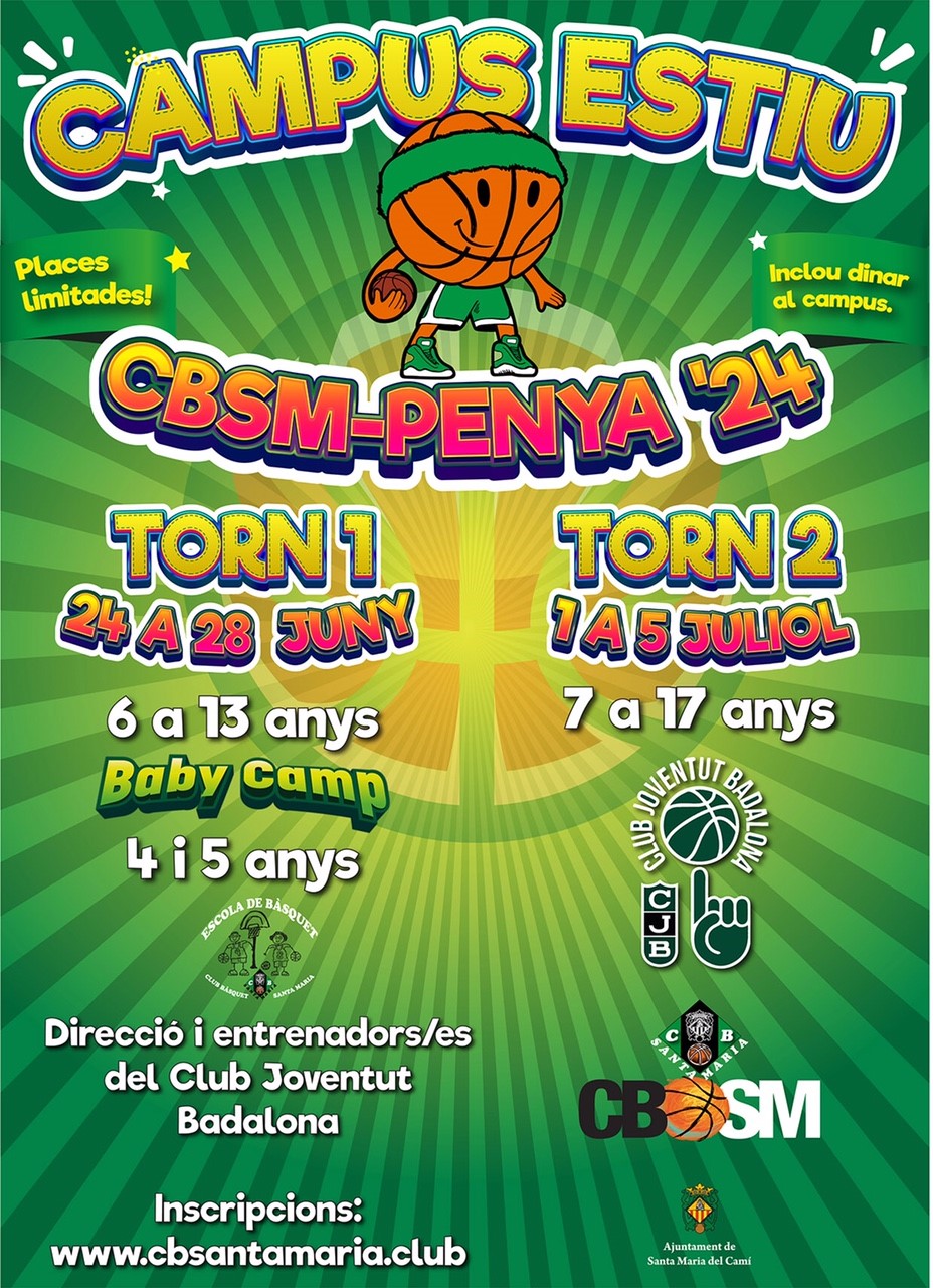 29 febrero 2024 | Por lorenzo | Categoria: PolideportivoJa està oberta la inscripció al Campus Estiu CBSM-Penya’24, amb direcció i entrenadors de Club Joventut Badalona, en dos torns: Torn 1 del 24 al 28 de juny per a nines i nins de 6 a 13 anys i Babycamp per a nines i nins de 4 i 5 anys. Torn 2 de l’1 al 5 de juliol per a nines i nins de 7 a 17 anys.
