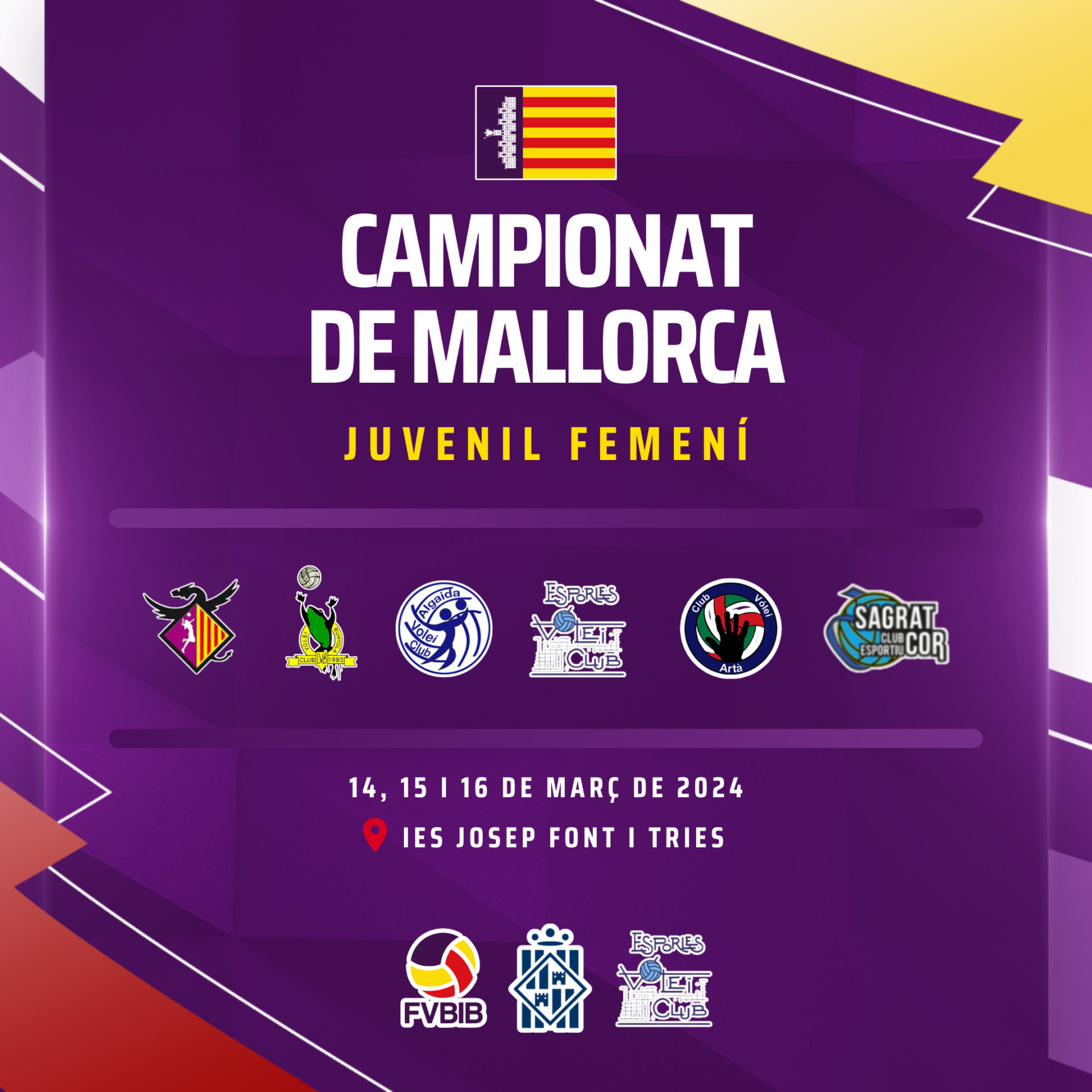 L’IES Josep Font i Tries decidirà des d’aquest dijous 14 fins el dissabte 16 de març qui són les campiones de Mallorca. Una vegada la lliga regular ha finalitzat amb el Wehostel Cide Palma com a primeres classificades, es disputa la fase final del torneig per conèixer qui són les guanyadores de la categoria juvenil a Mallorca i qui es classifica pel torneig autonòmic. El conjunt palmesà el disputa com a campió de la lliga domèstica i l’acompanyaran l’Expert CV Bunyola com a subcampió, el Complex s’Estació Algaida VC com a tercer classificat de la classificació, Il Forno Esporles, quart de la lliga, i el Big Mat Agrupació Artà i el Juniper CE Sagrat Cor com a cinquè i sisè classificat de la taula respectivament.