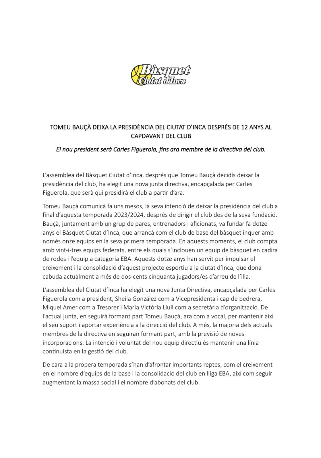 COMUNICAT OFICIAL BASQUET CIUTAT D’INCA