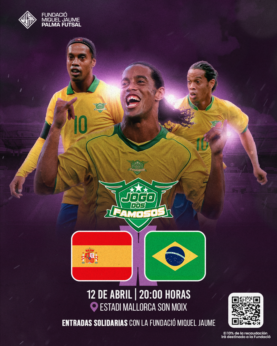 El Estadi Mallorca Son Moix acogerá el sábado un gran partido de estrellas mundiales lideradas por Ronaldinho y que será solidario con la Fundació Miquel Jaume. El ‘Jogo dos Famosos’, que asà se llama este partido de leyendas históricas de fútbol, es un duelo entre mÃticos jugadores brasileños capitaneados por Ronaldinho, el gran protagonista del evento, y una selección de leyendas españolas lideradas por Iván Campo, que se rodeará de exjugadores nacionales y amigos del mundo del fútbol, como Jovan Stankovic, y de fútbol sala, como MiguelÃn. La organización de este partido ha decidido colaborar con la fundación y donará el diez por ciento de las entradas que se vendan a través de un link exclusivo para la Fundació. Este link de compra se puede encontrar en las redes sociales de la Fundació Miquel Jaume y en la web del Illes Balears Palma Futsal.