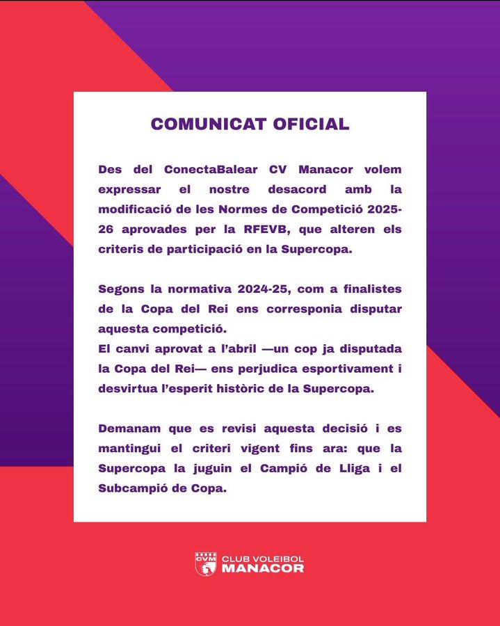 El Club Voleibol Manacor entiende que esta medida le arrebata de pleno el derecho a disputar la Supercopa y por ello ha remitido una carta de alegación y queja formal al comité de competiciones de la REFVB esperando que se imponga el sentido común y las normas de competición para 2025-26 no afecten a los resultados obtenidos en la temporada 2024-25, en la que el equipo manacorà se adjudicó la oportunidad de disputar la Supercopa de España.