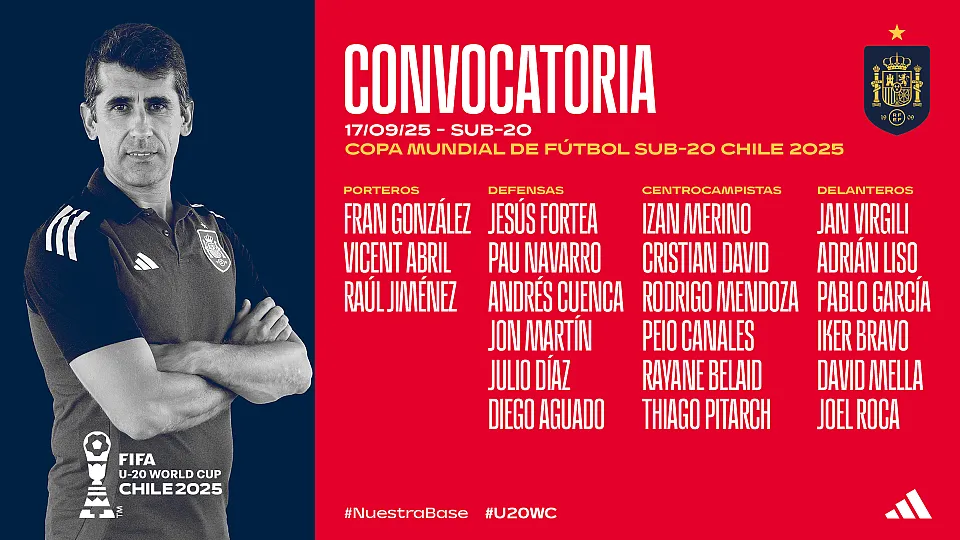 Son 21 futbolistas elegidos para un reto precioso, 21 futbolistas que defenderán con orgullo y honor a España en el Mundial sub-20 de Chile, que se celebra del 27 de septiembre al 19 de octubre. Paco Gallardo, seleccionador nacional, ha facilitado este miércoles la lista y ya el lunes 22 se viajará al paÃs andino para llegar en plenitud al inicio del torneo, el más prestigioso del planeta para esta categorÃa.