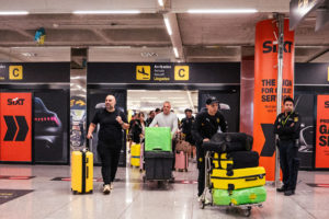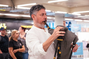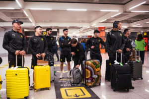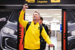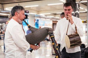 A su llegada, la expedición fue recibida con el sonido de las xeremies de la Escola de Música i Danses de Mallorca, en un acto que contó también con la presencia de representantes del Illes Balears Palma Futsal y de Miquel Àngel Bennà ssar, gerente del IME, para dar la bienvenida al equipo uruguayo.