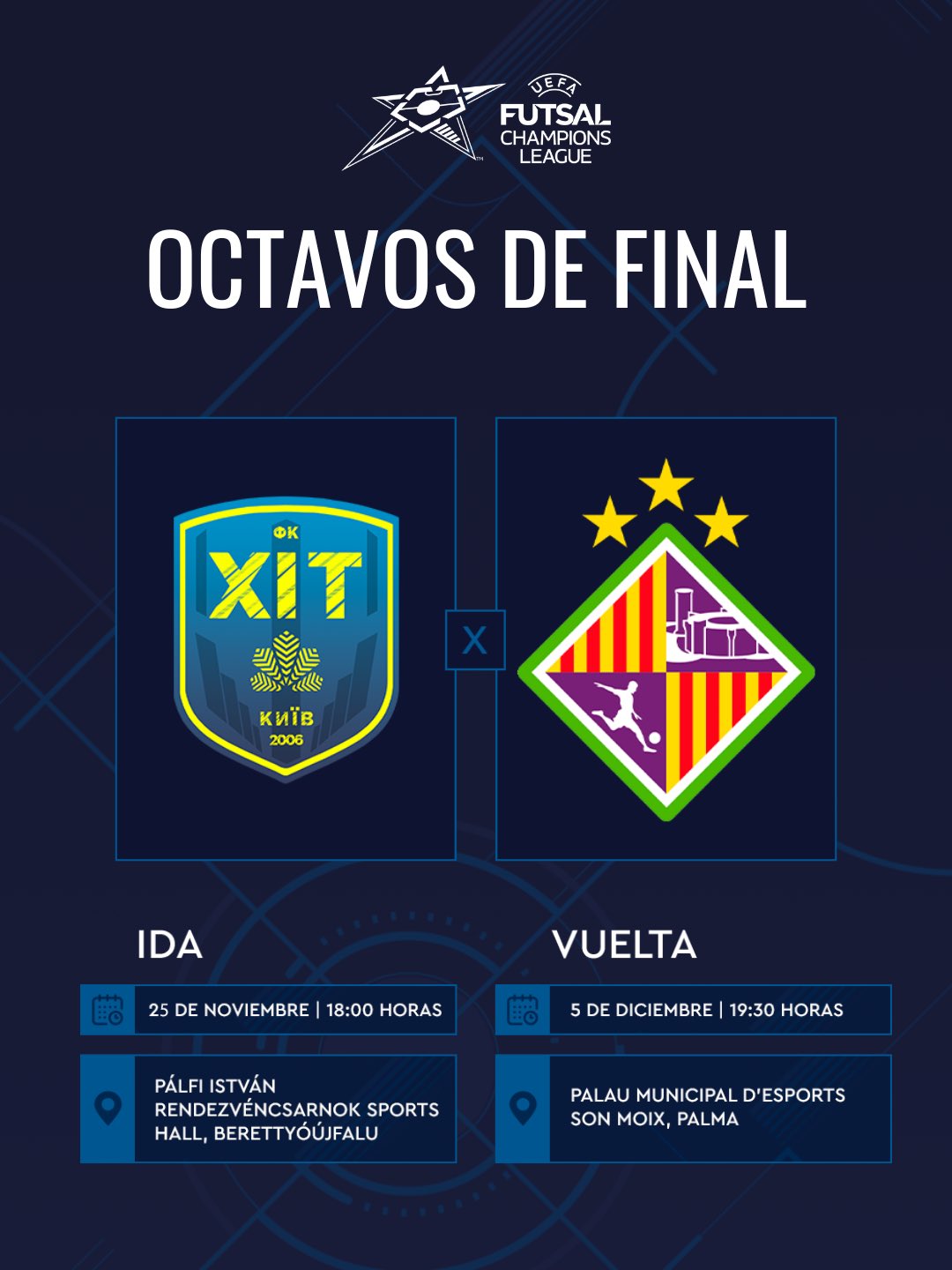 El Illes Balears Palma Futsal jugará el partido de ida de los octavos de final de la UEFA Futsal Champions League frente al Hit Kyiv en el Pálfi István Rendezvénycsarnok Sports Hall, en la localidad húngara de Berettyóújfalu, situada al este del paÃs y muy cerca de la frontera con RumanÃa.