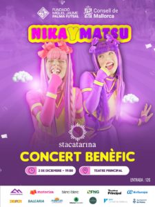El Consell de Mallorca i la Fundació Miquel Jaume–Palma Futsal impulsen un concert solidari que tindrà lloc el pròxim 2 de desembre a les 19.00 hores al Teatre Principal de Palma, amb el grup infantil Nika i Matsu, una de les propostes musicals més reconegudes i estimades pel públic familiar a Mallorca.