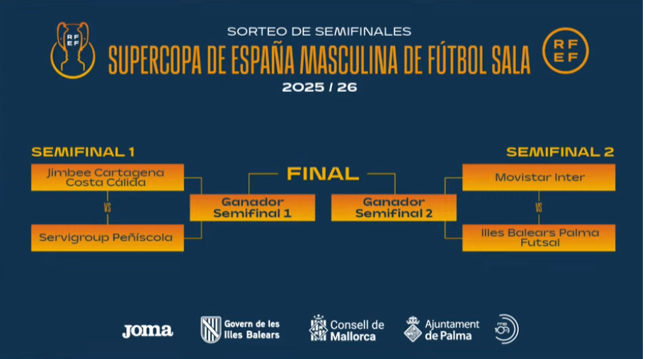 Movistar Inter será el obstáculo del Palma Futsal en su camino hacia la final de la Supercopa de España, que abrirá el año 2026 en el Palau d’Esports de Son Moix en el inicio de los actos de conmemoración del centenario de la Federació de Futbol de les Illes Balears (FFIB). El sorteo, celebrado este miércoles en el hotel Aumabar de la Playa de Palma. Los de Vadillo protagonizarán otro clásico a la caza de su segunda final en el torneo, tras la protagonizada en 2022, pero con la motivación especial de hacerlo en casa y ante su afición.