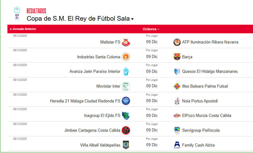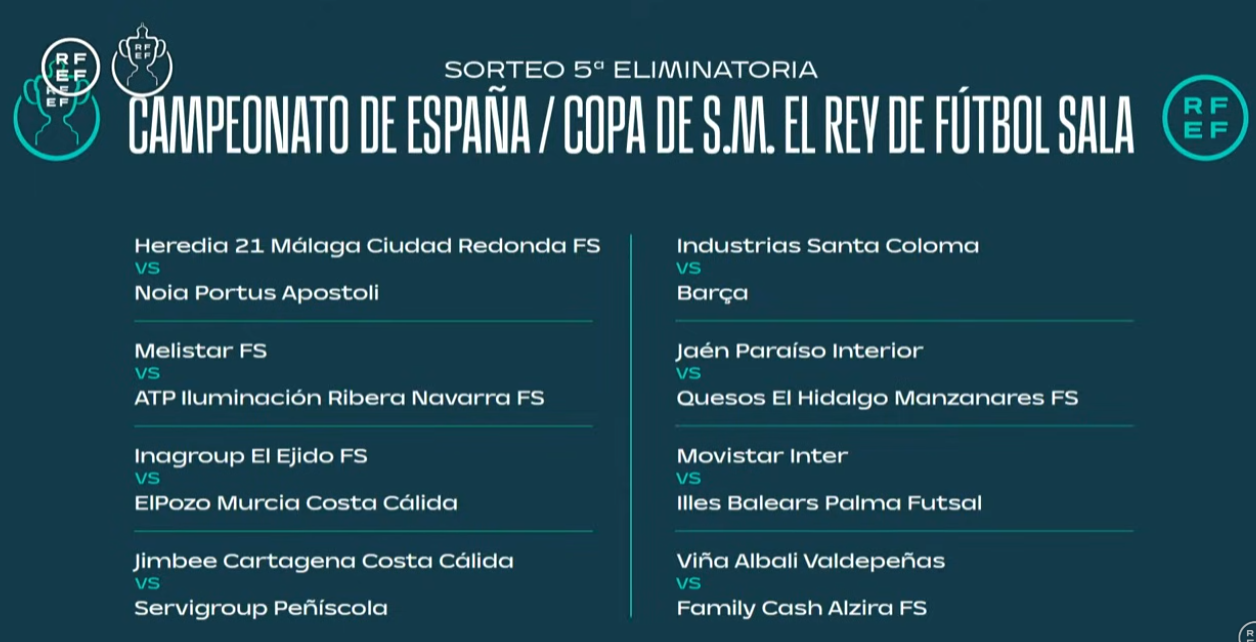 En esta eliminatoria estarán también presentes los equipos de Segunda División Heredia 21 Málaga Ciudad Redonda, Inagroup El Ejido y Melistar FS, así como los conjuntos de Primera División: Quesos El Hidalgo Manzanares, Barça, Jaén Paraíso Interior, Noia Portus Apostoli, Servigroup Peñíscola, Industrias Santa Coloma, Family Cash Alzira, Movistar Inter, ATP Iluminación Ribera Navarra, Viña Albali Valdepeñas y ElPozo Murcia Costa Cálida.