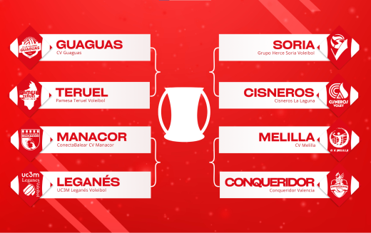 Llegado el ecuador del sorteo, solo quedaba conocer la posición de los cuatro equipos restantes para completar todos los enfrentamientos. La mano inocente de Pablo Herrera, seis veces olÃmpico en la modalidad de Vóley Playa y ganador de una medalla de plata, fue la encargada de confeccionar el cuadro final con la entrada de Conqueridor Valencia, Pamesa Teruel Vb, Cisneros La Laguna y UC3M Voleibol Leganés. A continuación, todos los enfrentamientos deparados por el sorteo: