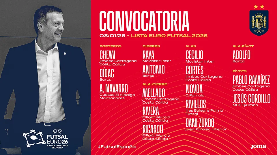 El seleccionador de fútbol sala, Jesús Velasco, ha hecho oficial la lista de 16 jugadores para el Europeo, que se disputará en Letonia, Lituania y Eslovenia del 21 de enero al 7 de febrero. De ellos, serán 15 los que viajarán el día 20 a Liubliana, incluyendo a tres porteros, de los cuales uno será el descarte, aunque existe la opción de una sustitución de un guardameta en caso de lesión.