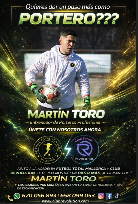 9 enero 2026 | Por lorenzo | Categoria: PolideportivoClub Revolution y Academia fútbol total Mallorca,da un paso más y lo hacemos con la seguridad de poder formar y trabajar porteros, de la mejor manera que debe ser ,un placer poderlo hacer con la ayuda de MARTIN TORO, un portero que viene de jugar en primera división por la juventud que tiene con tan solo 24 años , tiene una gran experiencia al haber salido de Mallorca durante estos años ,para poder jugar en todos y cada uno de estos clubes.