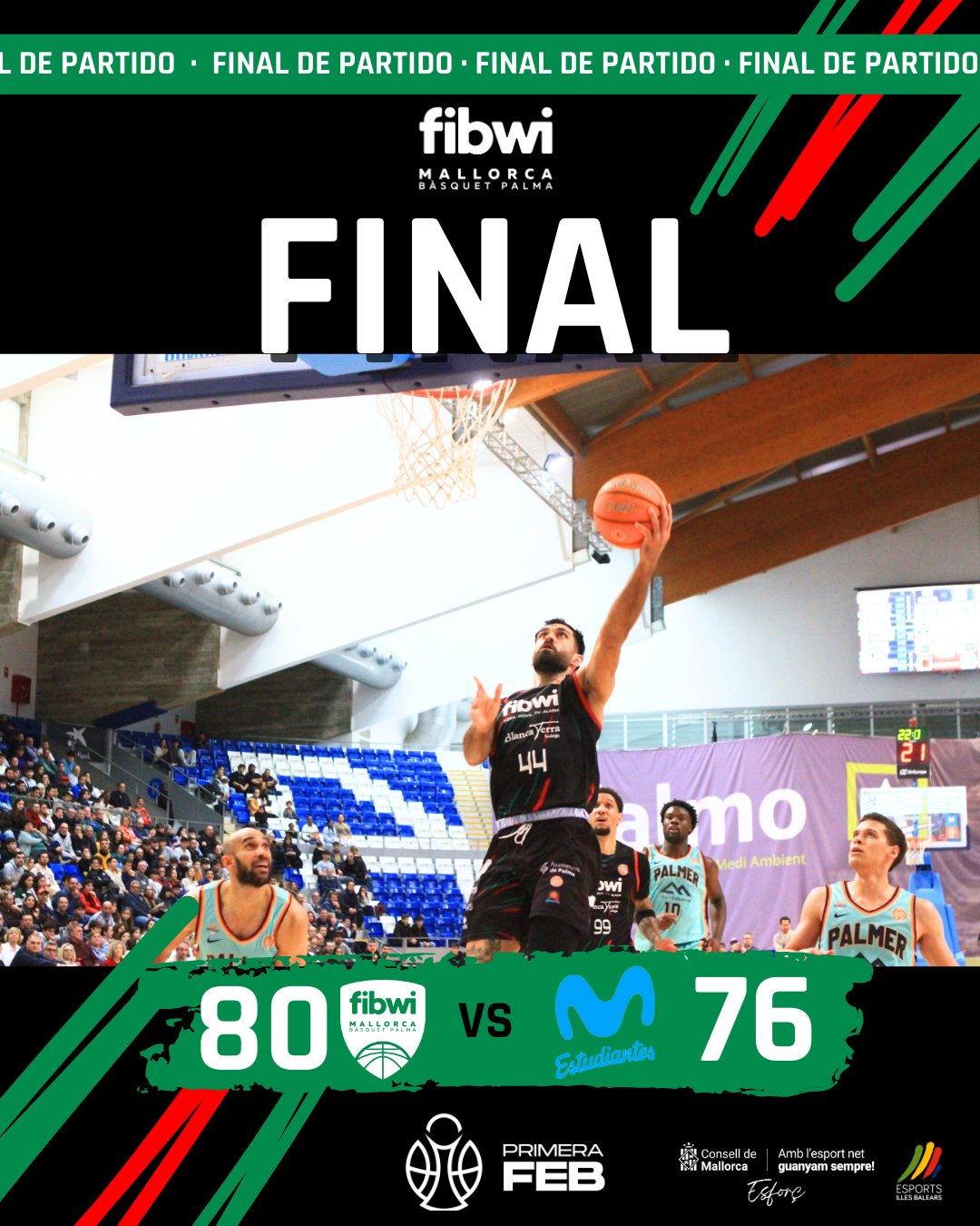 El Fibwi Mallorca Bàsquet Palma se ha llevado un triunfo espectacular y de prestigio ante el Movistar Estudiantes al que ha derrotado por 80-76. El partido arrancaba muy intenso por parte de ambos equipos con Lysander Bracey como referente anotador del equipo balear situándose el encuentro con 4-7 en el marcador tras un triple de Lucas Giovannetti. Aless Scariolo se erigía como referencia en ataque con cinco puntos consecutivos para poner el 12-11 en el marcador. Un igualado primer cuarto se cerraba con el Fibwi Mallorca Bàsquet Palma poniéndose por delante 19-18 tras un espectacular triple de Brian Vázquez que ponía en pie a Son Moix.