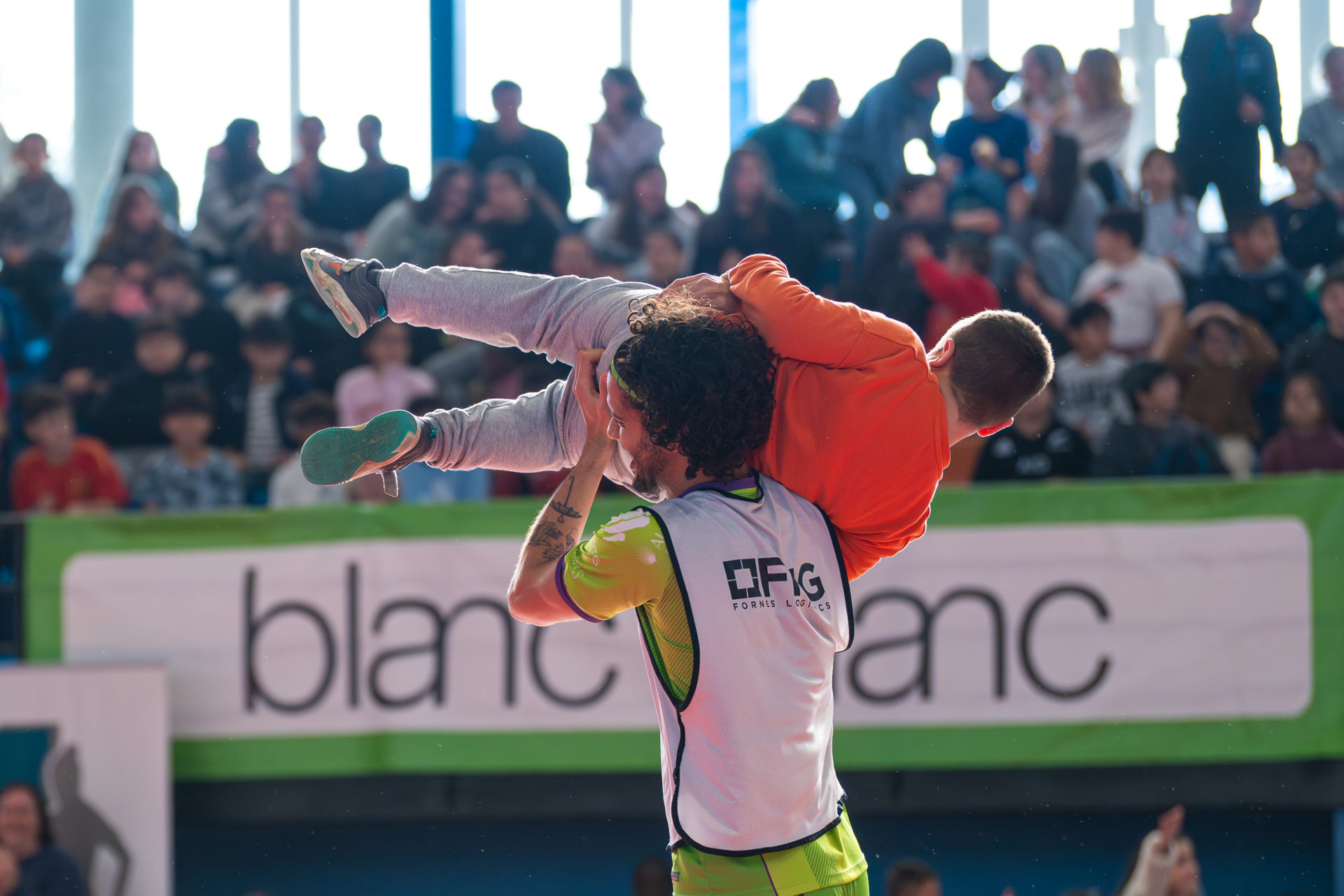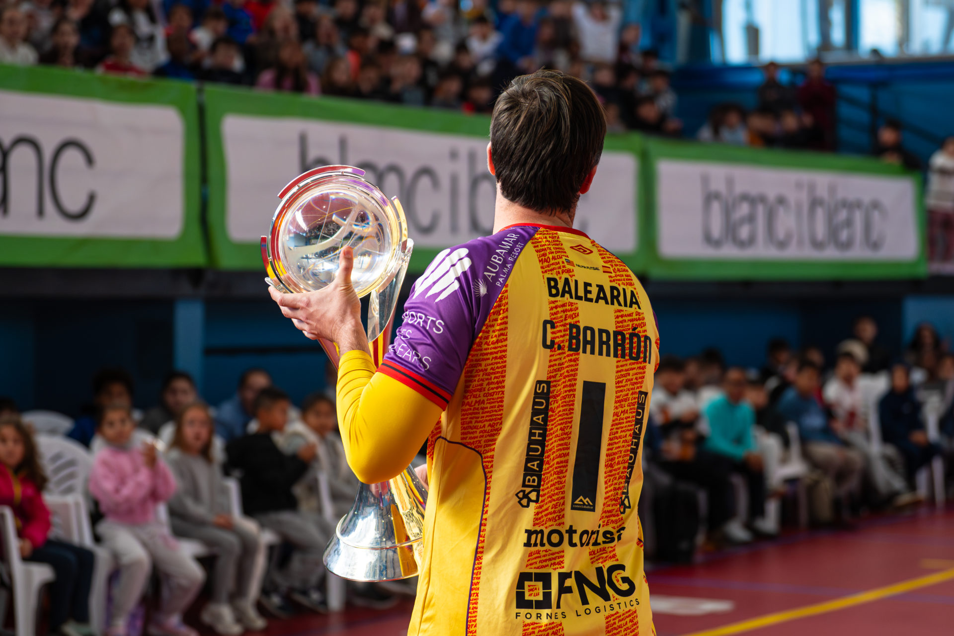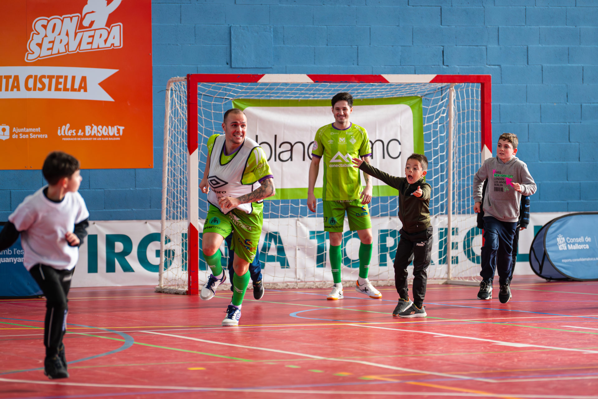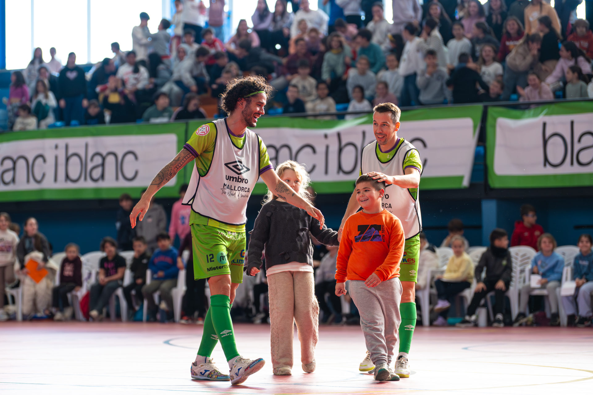Tras ello, jugadores y cuerpo técnico fueron presentados uno a uno y los asistentes pudieron ver de cerca los últimos títulos conquistados por el club: la UEFA Futsal Champions League alzada en Le Mans y la Copa Intercontinental lograda el pasado mes de noviembre en Son Moix. A partir de ahí, el polideportivo se convirtió en una gran pista de juego. Se formaron dos equipos, liderados por Carlos Barrón y Manuel Piqueras respectivamente, y arrancó un partido muy especial entre jugadores del Palma Futsal, salpicado de retos y pruebas anunciadas por los propios escolares.