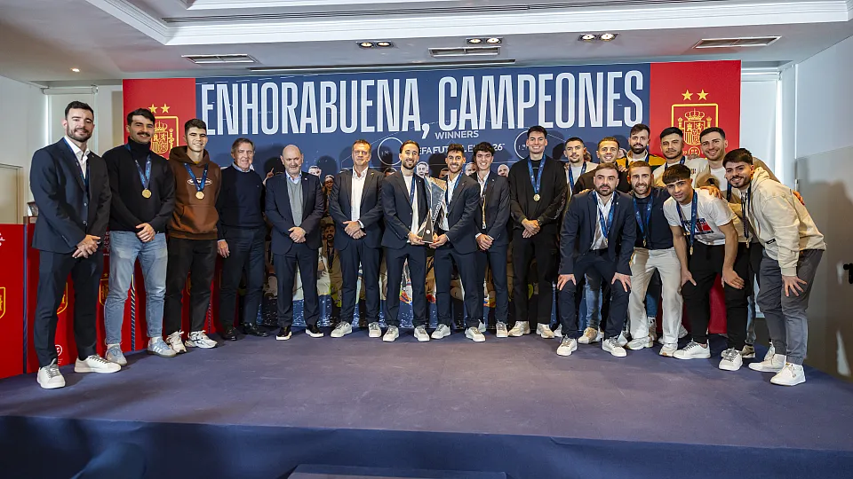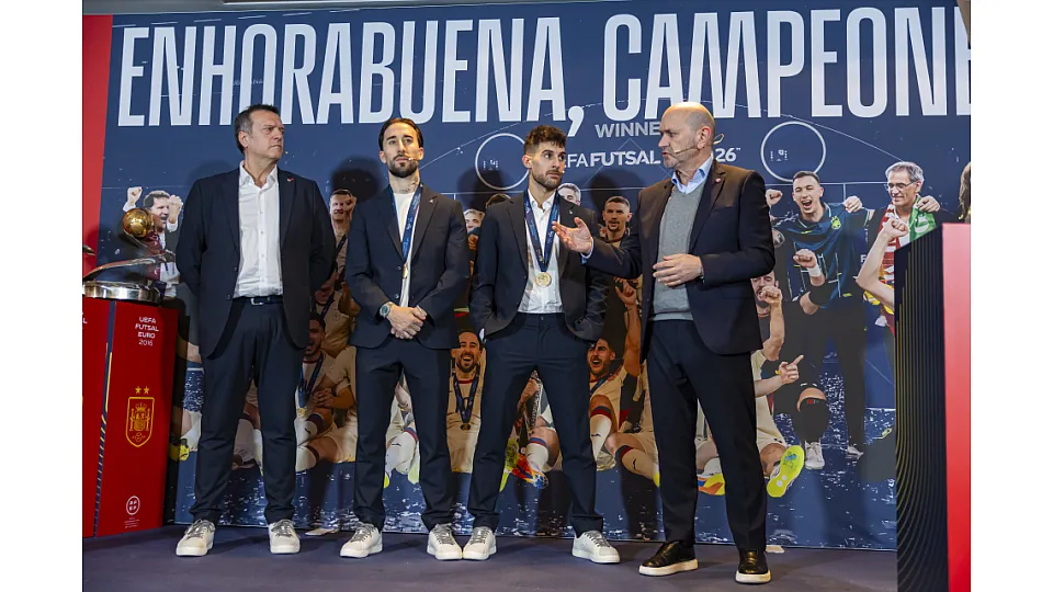 La Selección de fútbol sala ya se encuentra en España. La ocho veces campeona de Europa aterrizó este domingo en Madrid con el trofeo y fue homenajeada en un acto presidido por el presidente de la Real Federación Española de Fútbol, Rafael Louzán. Un acto que reconoce el trabajo del equipo dirigido por Jesús Velasco que ha vuelto a conquistar un título 10 años después del último, logrado en Belgrado.