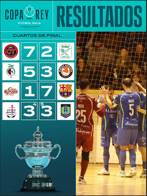 Si este martes fueron los conjuntos que actuaban como locales los que avanzaron a la Final Four de la Copa de S.M. el Rey, durante la noche del miércoles ese honor lo consiguieron los que actuaban como visitantes. En cualquier caso, el torneo ya conoce a sus integrantes en la última fase a disputar en CáceresJaén Paraíso InteriorJimbee Cartagena Costa CálidaBarça Viña Albali Valdepeñas se citarán en Cáceres los días 23 y 24 de mayo.