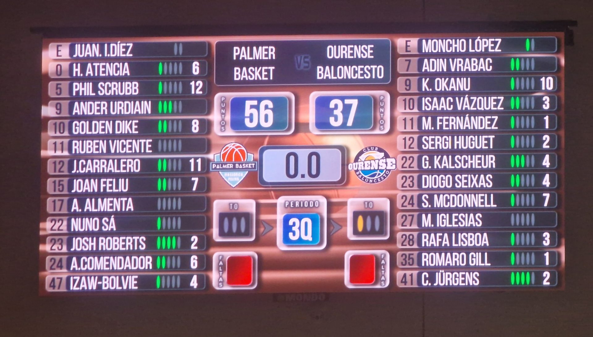 La seguridad ofrecida en defensa limitó de forma notable a las ofensivas gallegas. El bloque orensano no logró superar los 8 puntos en todo el tercer período. Las alternativas que el bando balear fue capaz de enseñar en defensa durante este intervalo brindaron al grupo las máximas diferencias. El pívot Golden Dike, con dos triples, uno de ellos sobre la bocina, hizo tiritar los cimientos de Son Moix con la colaboración de un público entregado a la causa, 56-37.
